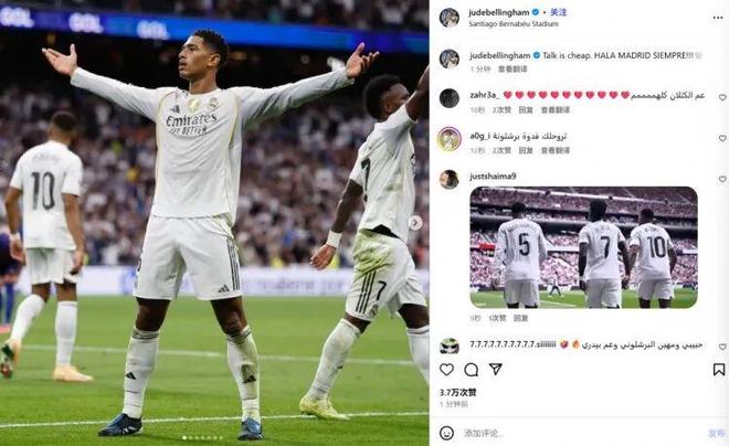 而本场比赛,此前风光无限的亚马尔犹如隐身,与其赛前的高调形成反差!全场2次打门无一射正,虽然8次过人4次成功,可21次丢失球权是皇马球员对其恶意言论的最有力回应。赛后,贝林厄姆通过社媒晒出自己的霸气庆祝照,并配文:“言语是廉价的,马德里永远前进!”这显然是在回击此前亚马尔接受采访时对皇马的公开嘲讽。
